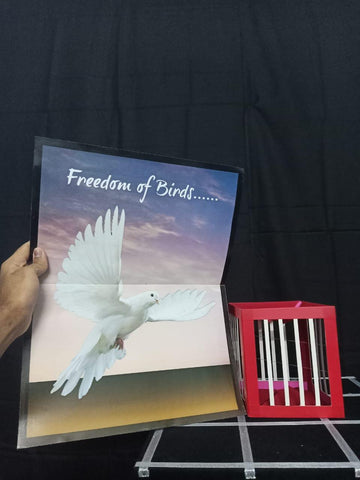 You show a poster of a caged bird and fold it. Now you tell your audience that birds should be free and remove out an actual cage from the poster.Finally , unfold the poster and the bird is uncaged and flying freely in the sky. A nice trick with a good message