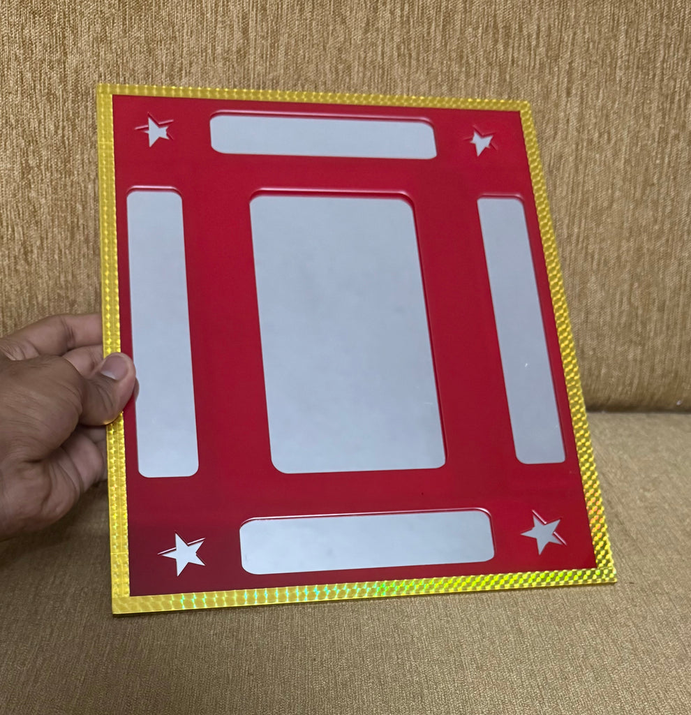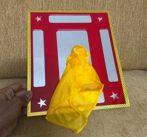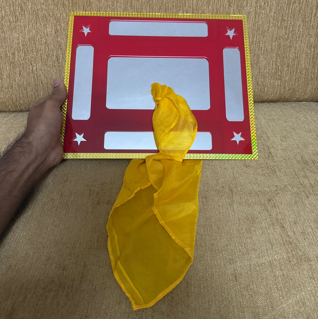 Performer displays a square shaped mirror frame. He also displays a silk . Performer then inserts the silk through the mirror and pulls it out from the other side and the mirror remains solid and unharmed.
